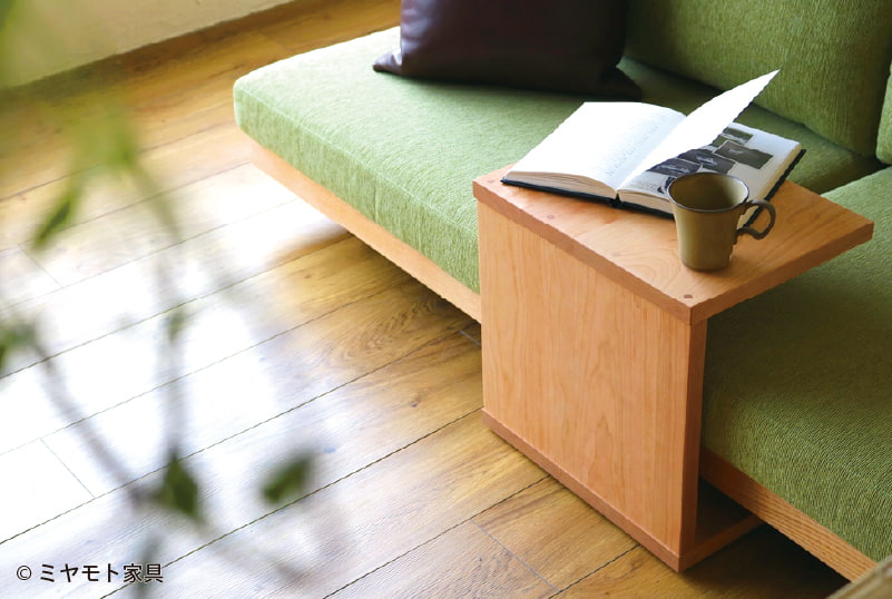 また、ラグやソファーでくつろぐときに飲み物などを置けるサイドテーブルも人気が高く、コの字のかたちの縦置きタイプがよく選ばれています。