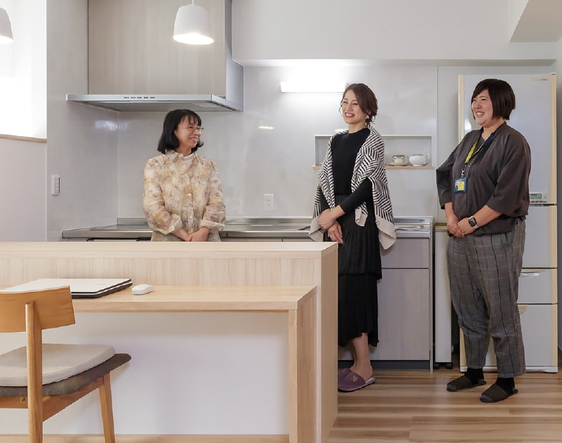 奥様は対面キッチンを希望されていましたが、配管の関係で難しく、代わりにカウンターを設けています。対面キッチン風の雰囲気をつくるだけでなく、キッチンをほどよく隠し、作業スペースと収納力を確保するアイデアです。カウンターテーブルは、家事の合間のパソコン作業などに便利。