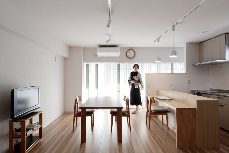 まっさらな状態からレイアウトされた4LDKは、新築とほぼ変わらない美しさ。「明るい家にしたい」というご家族の希望どおり、LDKの大きな窓から入る光が白い壁に反射し、家じゅうを明るく照らします。LDKは、物干しスペースを仕切る壁の高さを低くしたり、洗面化粧台の間仕切りをなくす工夫で、広く開放的になりました。