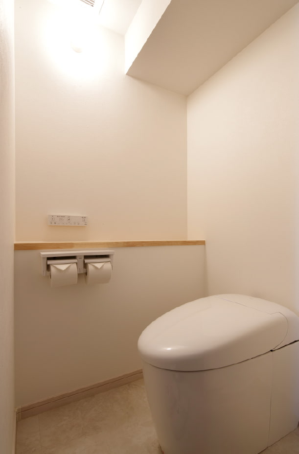 ものが多いというご家族のため、収納にもこだわりました。大きなものや隠したいものは、全てリビング横のパントリーに。花粉症対策として、コート類を居室に持ち込まないようハンガー収納の位置も考慮しています。リビングの棚も、職人さんと細かく打ち合わせて造作しました。配管があり下がり天井になってしまうトイレは、便器の向きなど考慮し、狭さを感じないよう考えられています。