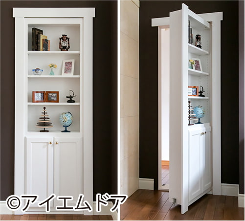 特殊な蝶番によって棚そのものが開閉する戸棚タイプの隠し扉