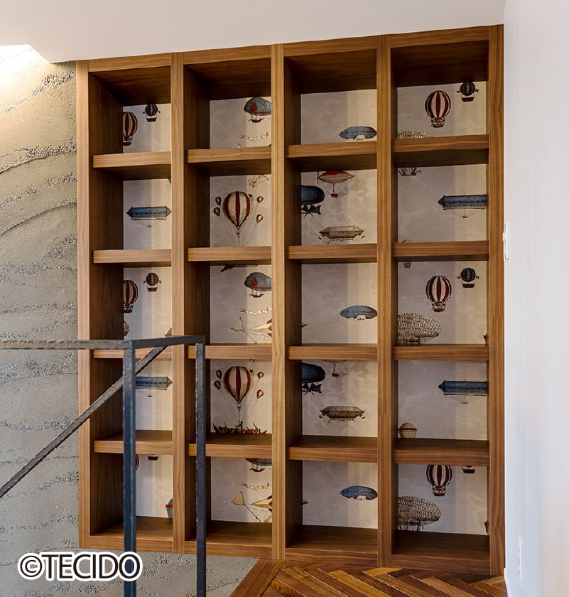 シェルフの内側にPOPなクロスを貼る、アクセントクロスのアイデア