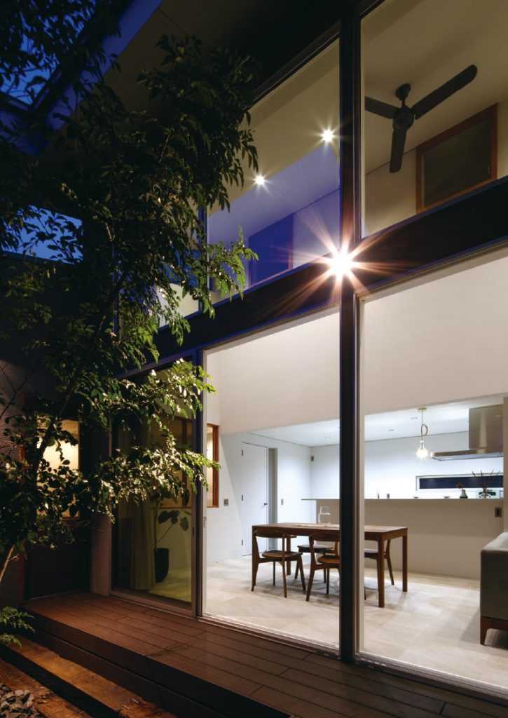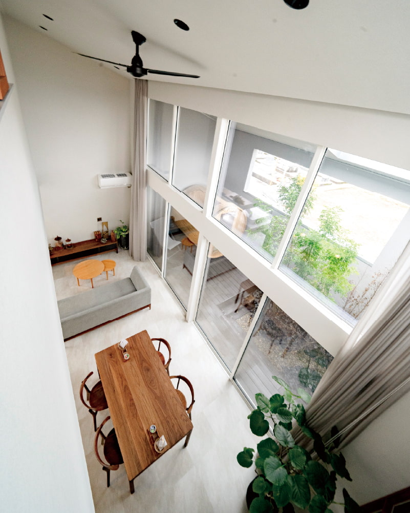 もうひとつのこだわりは、5mの天井高。同じ広さであっても天井が高くなるだけで、解放感がぐっと高まります。さらに、閉鎖的な空間を可能な限り削ぎ落とすため、LDKにはガラスを多用。中庭に面した壁一面のガラス張りと、天井から床まで届く5mのカーテンは圧巻です。