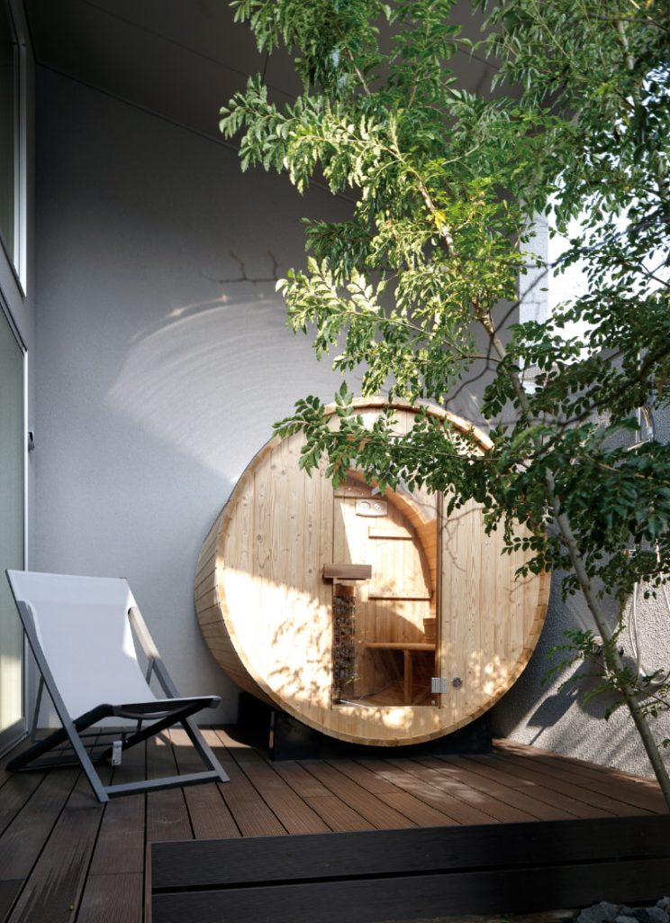 「風や光、空を毎日感じられる、森の中の家」のイメージをベースに、屋内と屋外の境が融合したような一体感を目指し、さまざまな工夫が凝らされています。最も特徴的なのは、サウナのある中庭です。中庭には、大きな天窓のついた屋根と2箇所の開口があり、プライバシーを確保しつつ空や風を感じられるつくり。ウッドデッキと一体化したような、木材の温もりを感じられるバレルサウナは、外気浴も楽しめる特別な空間です。中庭で涼んだらそのまま寝室に行ける間取りも快適。