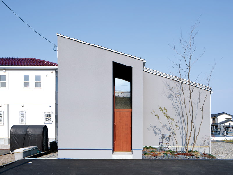 別荘地に佇むゲストハウスのような外観。シャープな片流れの屋根のラインに沿ったスリットが独特な洗練されたデザインです。吹き抜けの高い天井と高窓のある玄関は、足を踏み入れた瞬間から、ダイナミックな解放感を感じさせます。
