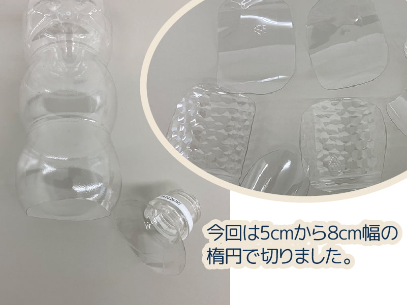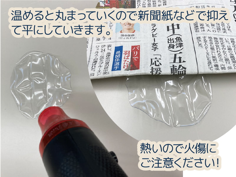 ペットボトルを切り抜き、ドライヤーで温めて平にします。