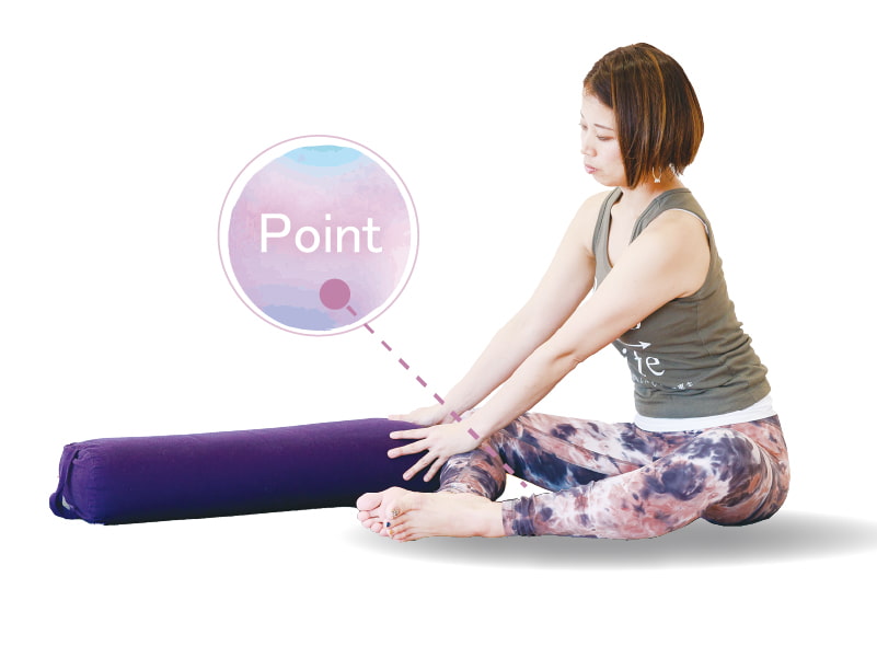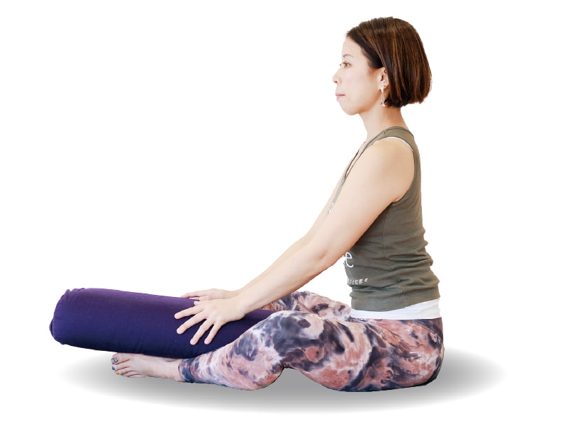 ボルスターを脚のあいだに置き息を吸って背筋を伸ばす