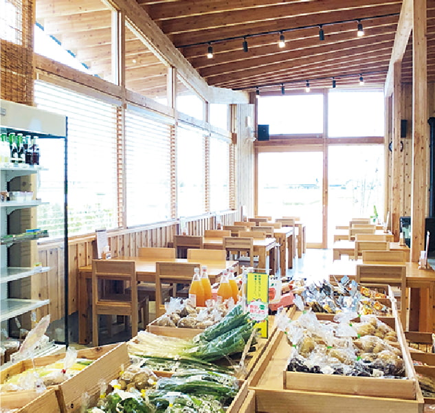 また、店舗と家具にも、県産の立山杉を採用。地元の職人が制作したオーダー家具は天然無垢材ならではの心地良さで癒される。休日には子供たちのサッカーを観戦しながら、大人は元気をもらえる、県内では珍しい県産品直売所併設のカフェ。