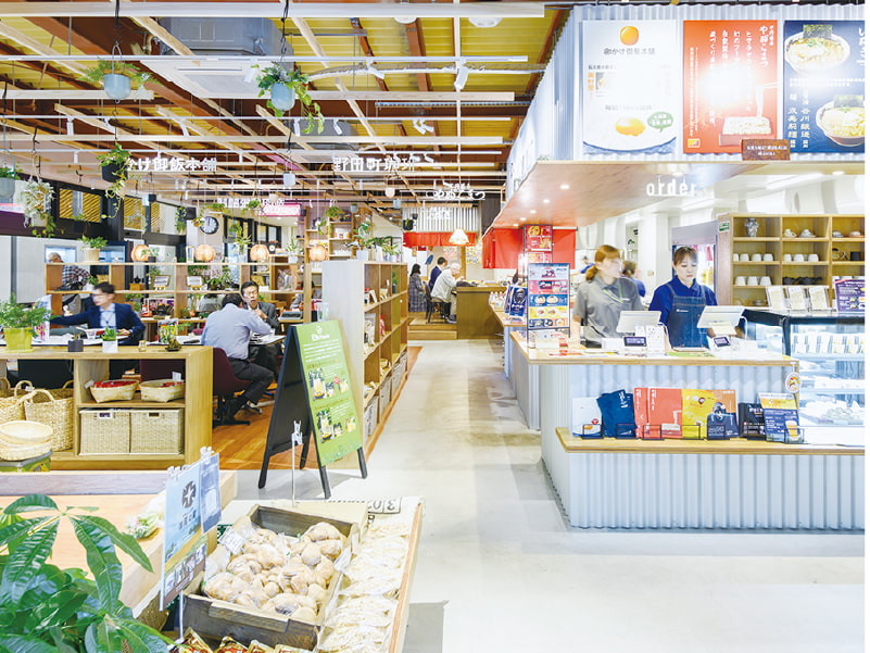 駅の構内に観光案内・お土産ショップ・フードエリア・コワーキングスペース・ギャラリーなどが同居。