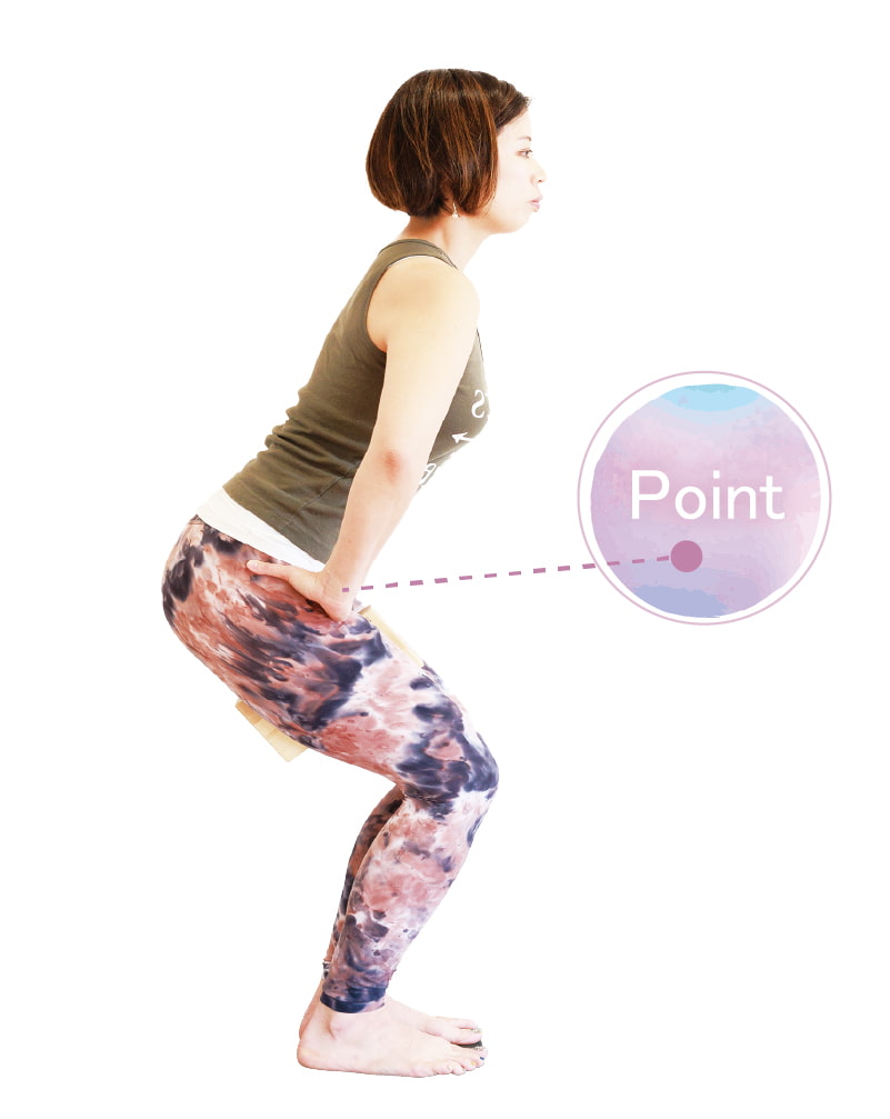 太もものつけ根に小指側を当て、上体を股関節から前に倒す。息を吐きながらゆっくり後ろにお尻をひく。