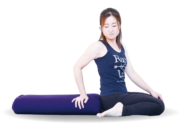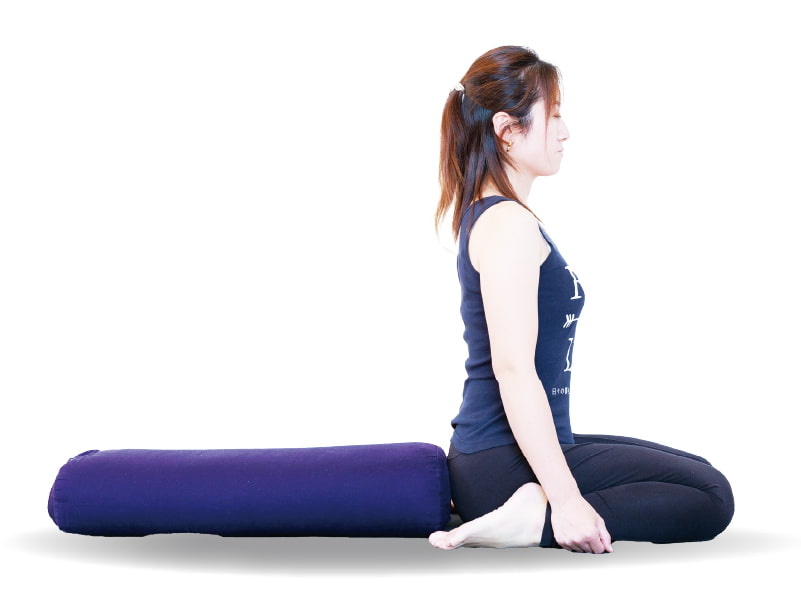 正座し、ボルスター(またはクッション)を長さが短い側がお尻に当たるように置く。両足をお尻の外側に出してお尻を床につける。