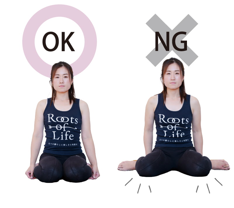 両足をお尻の外側に出した時に、両ひざは揃える。ひざが開くと調整したい部分に効かない。