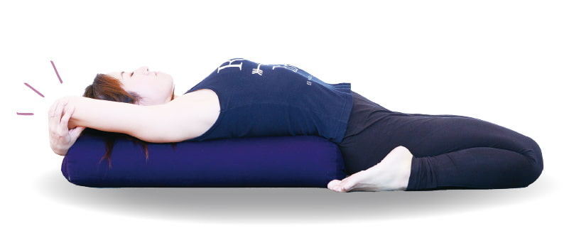 両手を体の後ろのボルスターにつきながら、ゆっくりと上体を後ろに倒し、あお向けになる。