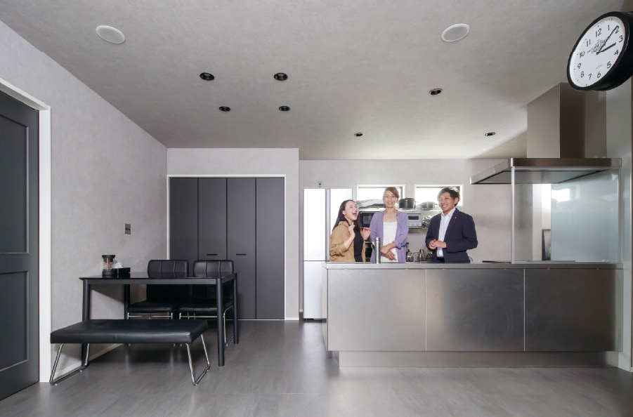 スタイリッシュさが際立つオールステンレスのキッチンは、無駄な凹凸が一切ないフルフラットスタイル。冷蔵庫やシェルフ、鍋やフライパンまでステンレスで揃えたプロの厨房のような世界観に「モチベーションが上がる」と奥様。ご夫妻でキッチンでお酒を飲みながら過ごすことも多いそうです。