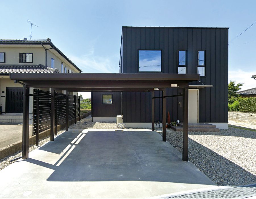 「無機質な感じの家にしたい」とのご要望で、外観・内装は、ともにグレー・ブラック・ステンレスシルバーで統一されています。アクセントウォールには木毛セメント板をあしらい、インダストリアルなテイストをプラスしました。