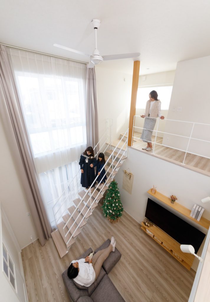 オープン階段はカーテンの動きを妨げない位置に、ツリーの高さも考えて配置しました