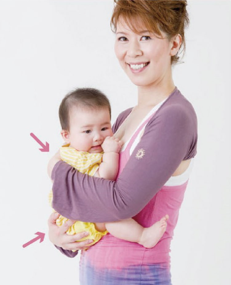 ママの脇が空きすぎてしまうと、赤ちゃんは不安定になるので注意。また、赤ちゃんのお尻が落ちすぎないように気を付けましょう。