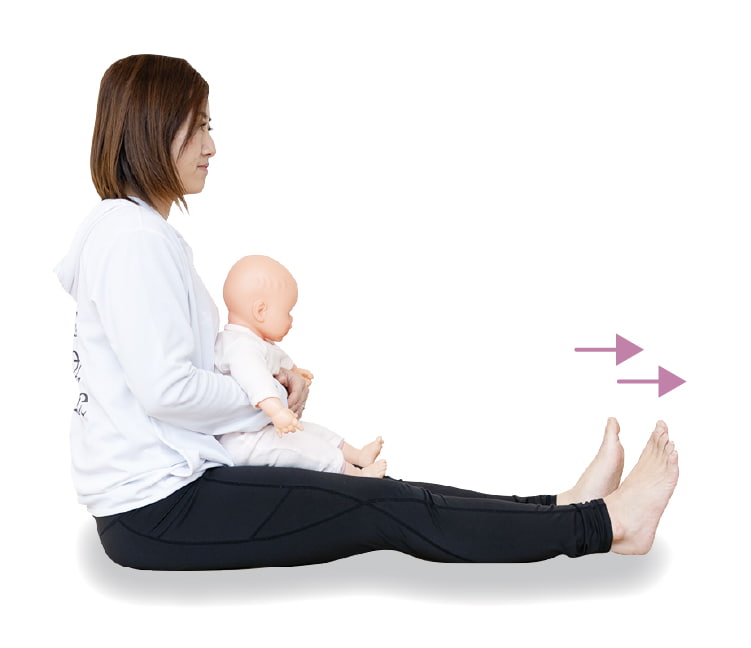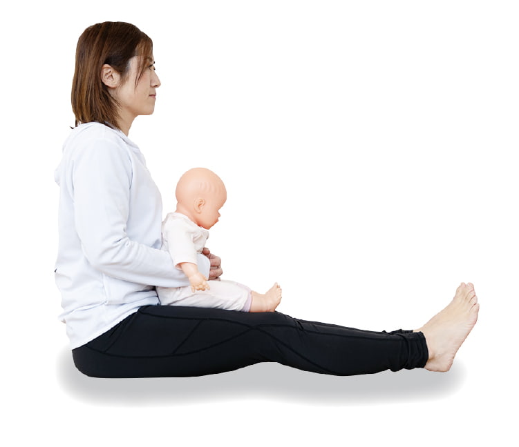 床に座り、脚を揃えて前に伸ばす。坐骨を立てて、あごを軽く引き背すじを伸ばす。手を赤ちゃんのお腹の前で組んで脇を軽く締め、目線は正面に。