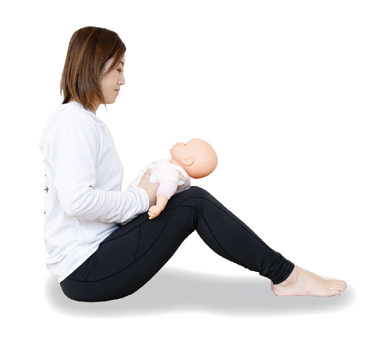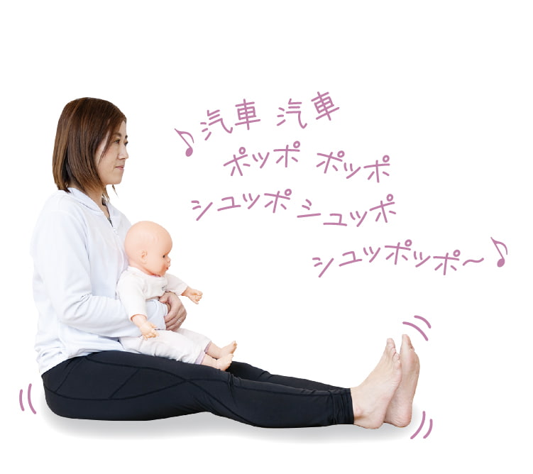 両ひざを伸ばして、太腿の上に赤ちゃんを座らせ、お腹の前で手を組みましょう。