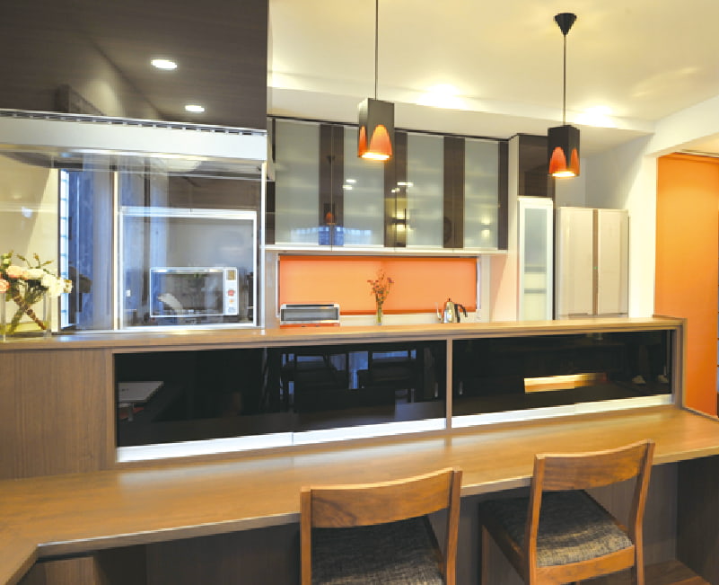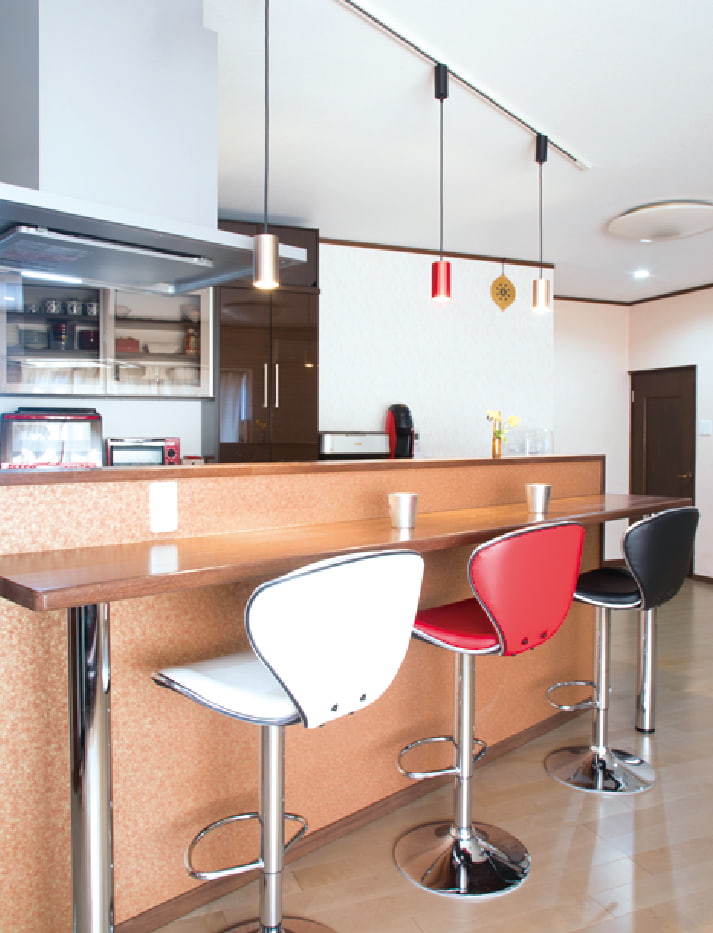 キッチンを壁付から変えられない場合でも、カウンターを設置することで対面キッチンの良さを取り入れることができます。キッチンをほどよく目隠しし、ダイニングとの中継エリアとして活躍します。