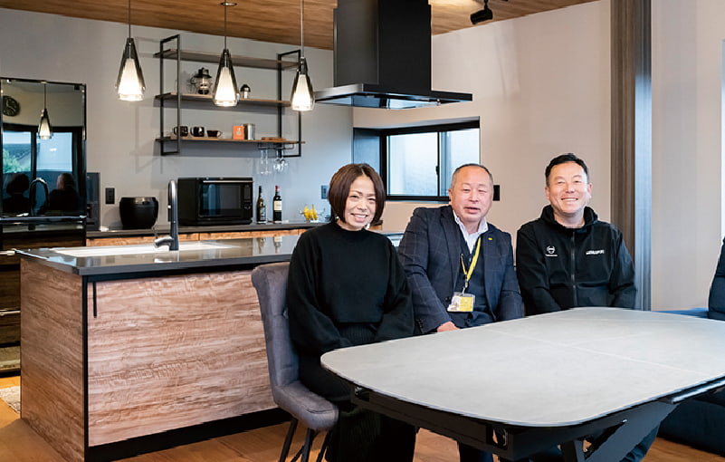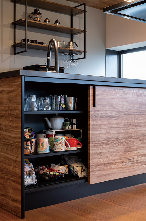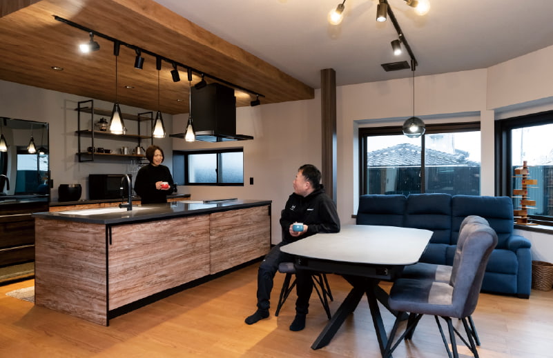 スポルテッド杢目が美しいキッチンは、ご夫婦がタカラスタンダードのショールームで一目惚れした最上級のキッチン「レミュー」です。ブラック×ウッドを基調としたクールな色彩に合わせて内装もコーディネートしました。