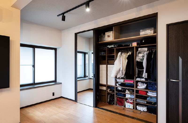 スッキリとした空間づくりを念頭に置いてデザインされたLDKに散りばめられたこだわりのひとつは、3枚引込戸の収納スペースです。開閉しやすい引き戸の収納には、子供達が毎朝スムーズに準備できるように着替えや学校のものが全て入ります。ここで身支度を済ませられるように引き戸の1枚は鏡になっています。また、収納内にはWi‒Fiルーターを隠し、PCスペースとしても利用できる設計となっています。