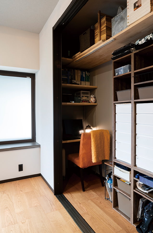 収納庫内にWii-Fiルーターを隠し、PCスペースに。生活感を排して家をスッキリさせる、使い勝手の良い配慮が散りばめられています