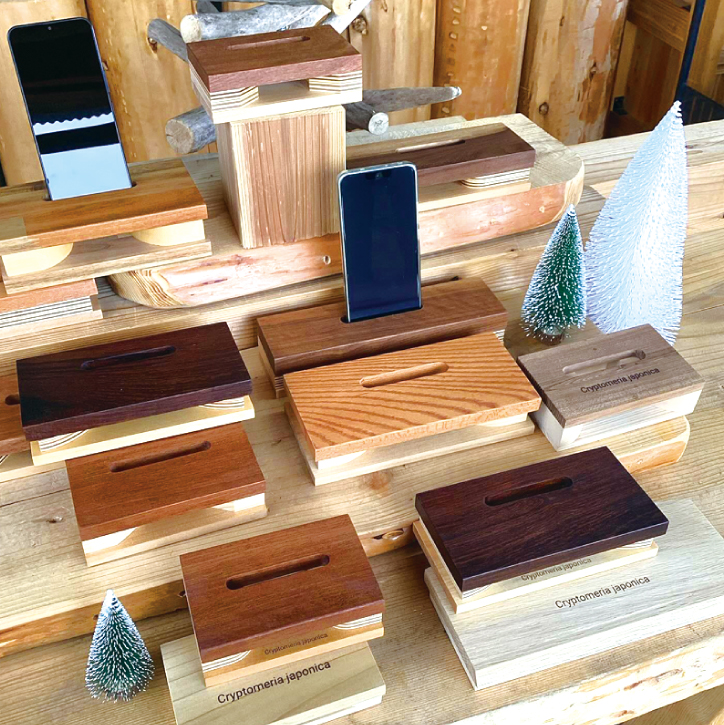 天然木でつくられたスマホスピーカー。木の種類によって音の響きが違う