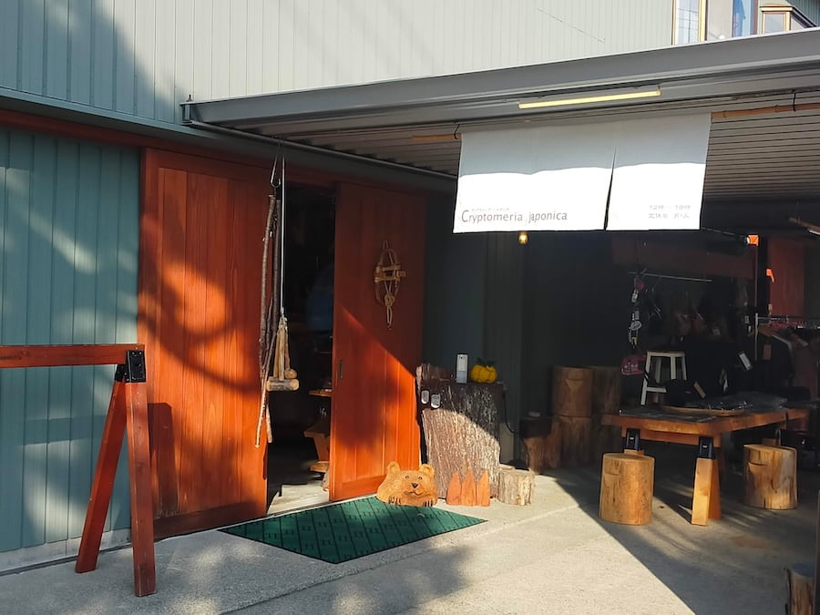 「日本杉」の学名に由来する店名の通り、店内は木のぬくもりに溢れ、木製の雑貨や椅子、高感度のアウトドアギアが並びます。