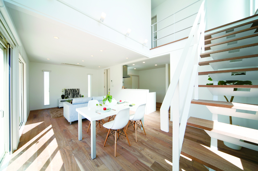 1階が見渡せる対面キッチンでは、家族との会話も弾みます。吹き抜けのリビングイン階段は、居間を導線の中心に考えた、家族のコミュニケーションが生まれる設計。